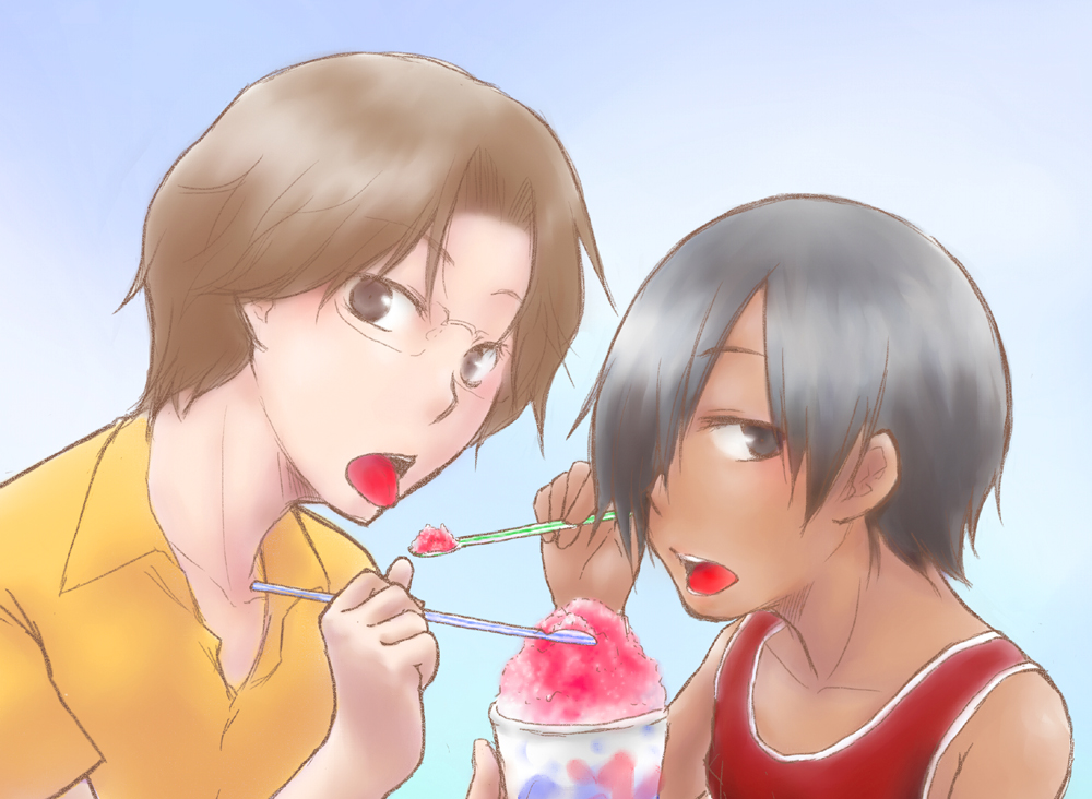 ちなみにこの絵、当初はもひとつかき氷あるはずだったんですが、ごっちゃになるし入れるスペースがなかったのでイチゴ味だけになってしまいました・・・佐久間にブルーハワイ食べさせて舌真っ青にさせたかったのにwww